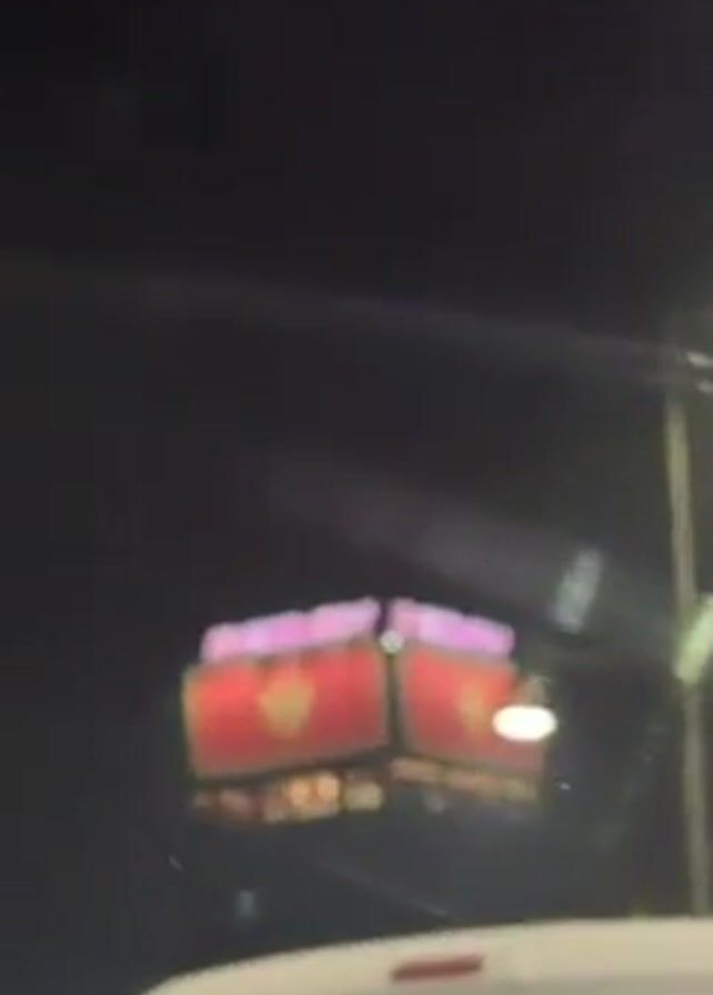 At night, a car drives past two signs for Bemax, with the Montenegrin flag on them