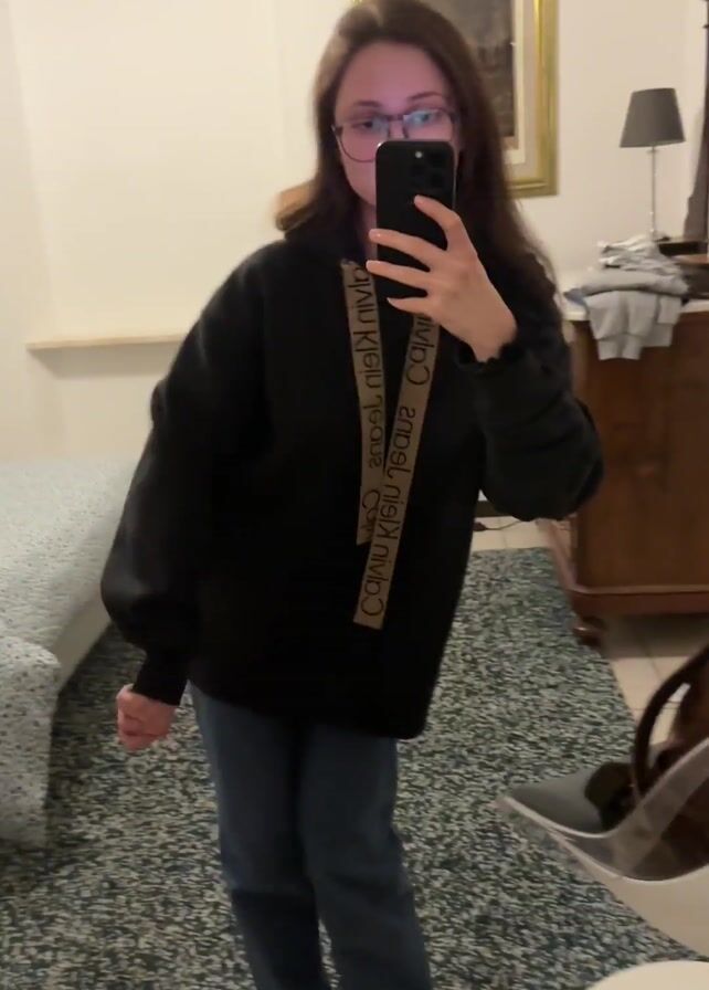 A young woman is taking a selfie in a bedroom. She is wearing glasses, a black hoodie with a tan strap across it, blue jeans, and white socks. The room contains a bed, a dresser with a mirror, a painting on the wall, a lamp, a rug, and a clear plastic chair with a backpack on it. She is holding her phone in her right hand and looking at the screen, briefly puckering her lips.