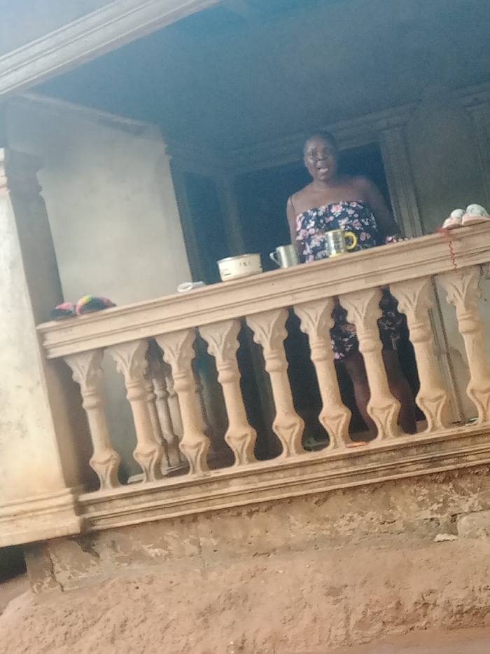 An upward-angled, candid photograph depicts a single adult individual on a residential balcony in Eziudo, Nigeria