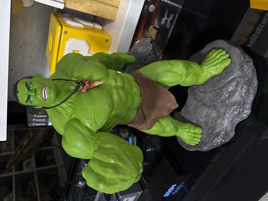 A green Hulk figure with a tooth necklace and brown loincloth stands atop a gray rock