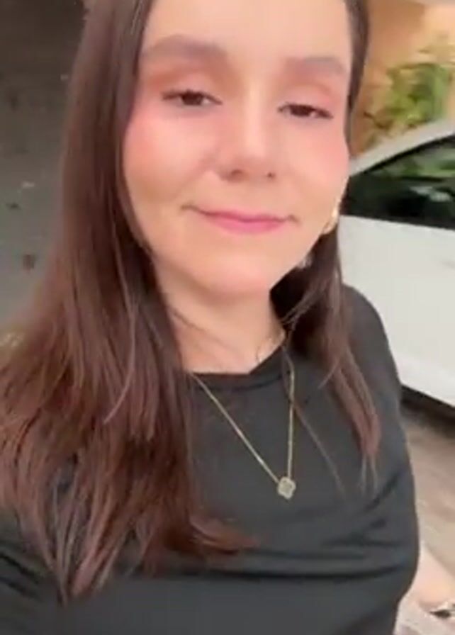 A woman is recording a video of herself. She is wearing a black shirt and has long brown hair and gold earrings. She is also wearing a gold necklace with a clover pendant. Her makeup includes pink blush and eyeshadow. Behind her is a white car and what appears to be the outside of a house. Another person's arm holding a black object moves in the frame. The woman smiles at the camera throughout the video.