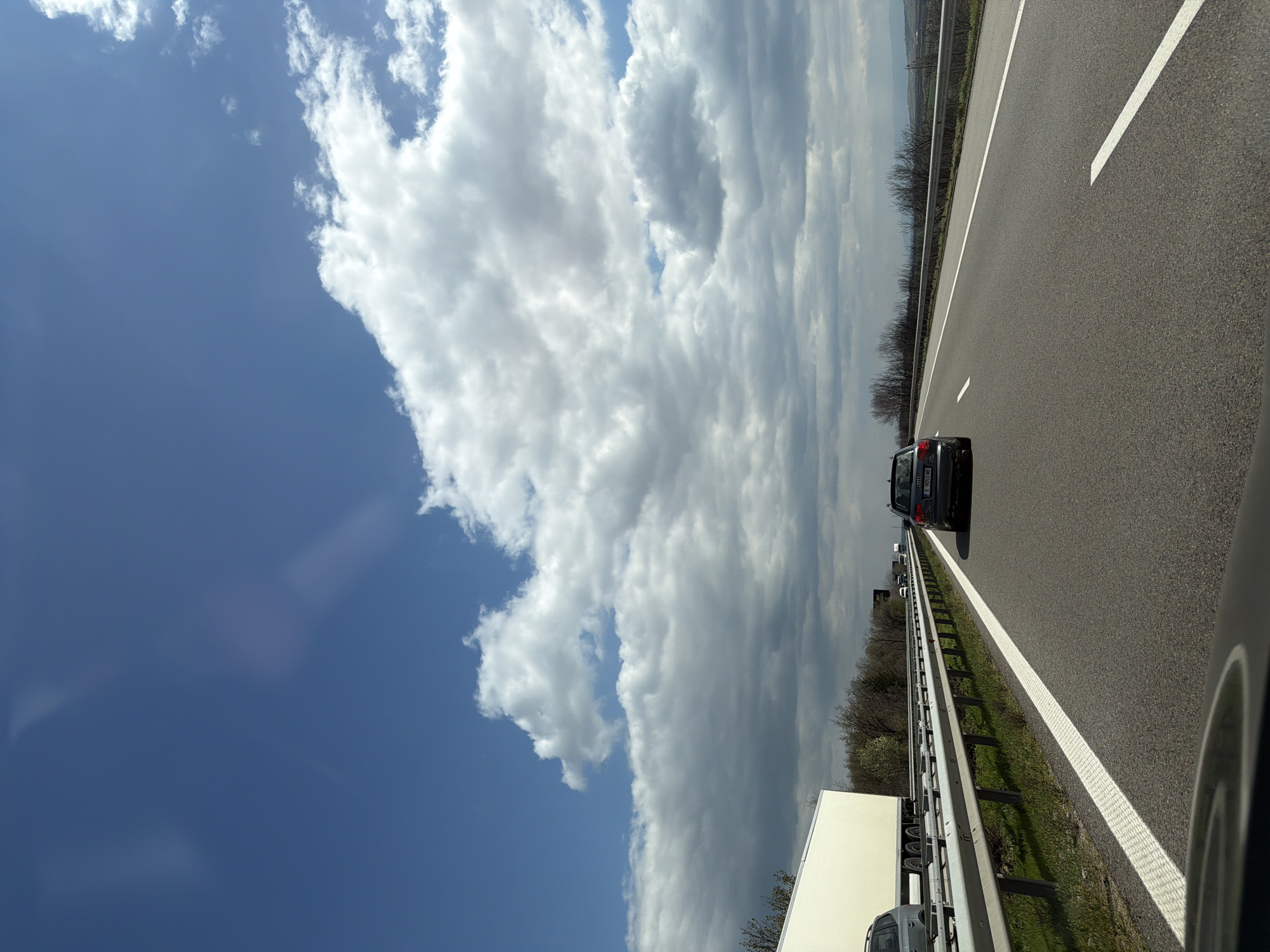 The image depicts a highway scene, possibly taken from a moving vehicle. A dark-colored car is visible ahead, traveling in the same direction. The road markings are clear. A guardrail separates the lanes from the side. Beyond the guardrail, there's some sparse vegetation. The sky above is partly cloudy with patches of blue. The picture is possibly from the city of Kalugerovo, Bulgaria. There's no presence of people depicted in the scene. The environment appears to be on an open road or highway.