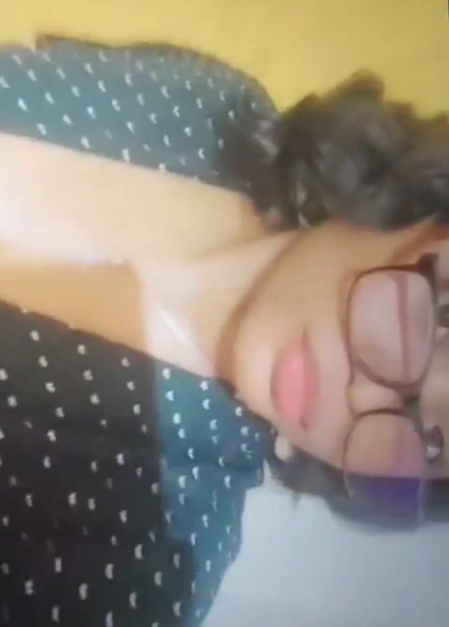 A young woman with dark hair and skin, wearing glasses and a blue polka dot top, is lying down in front of a yellow wall. She looks directly at the camera, her expression neutral. She seems to be filming herself. There is a pause symbol overlaid on the image briefly.