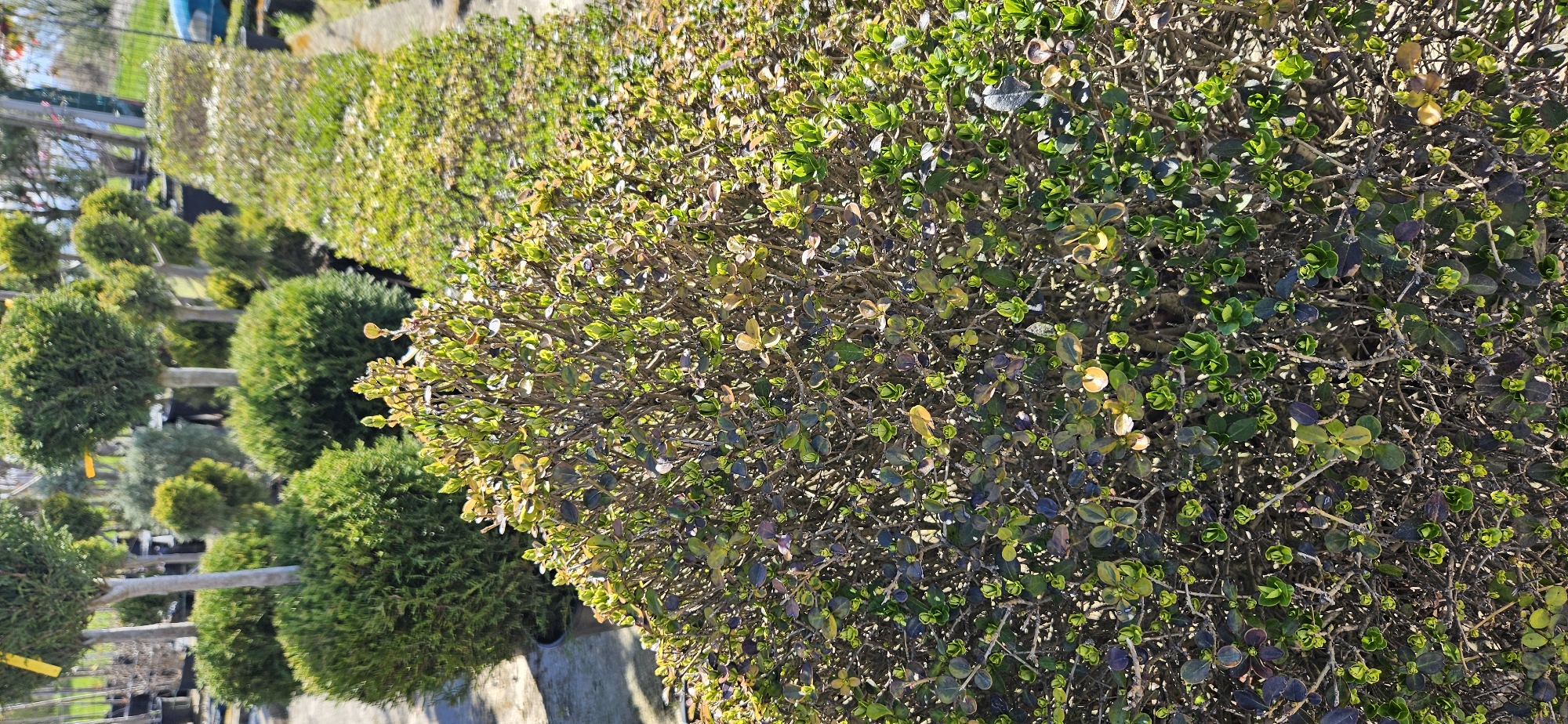 rows of potted shrubbery in what appears to be a plant nursery