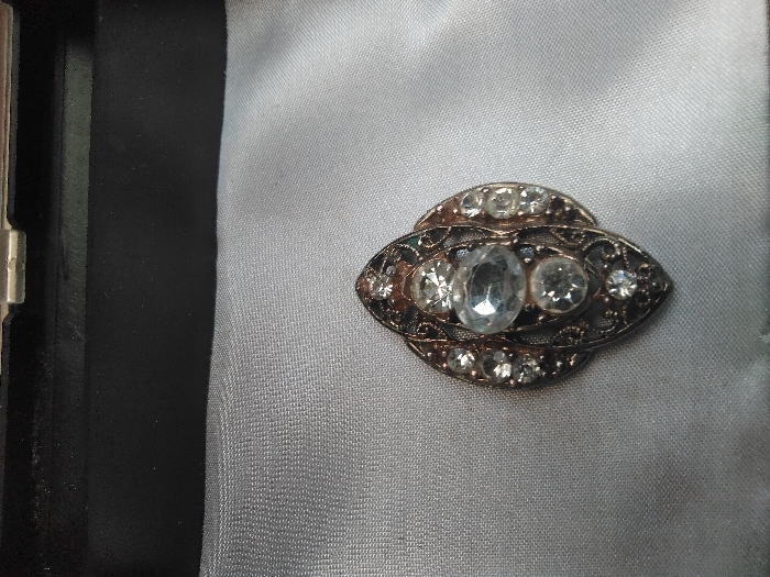 A single, ornate, oval-shaped piece of jewelry, identified as a brooch or pendant, rests on a light grey, subtly wrinkled, satin-like fabric lining. The jewelry exhibits a dark-toned metal frame with intricate filigree scrollwork. It is set with one prominent oval-cut clear gemstone centrally located, flanked vertically by a smaller round-cut clear gemstone above and another below. Multiple additional small, round-cut clear gemstones are embedded along the perimeter of the metalwork. The fabric lining is contained within an open dark-colored jewelry box, the upper edge and a partial metallic hinge or clasp mechanism of which are visible at the top of the image frame. No individuals are present, and no actions or interactions are depicted within the static scene. The location is Astana, Kazakhstan.