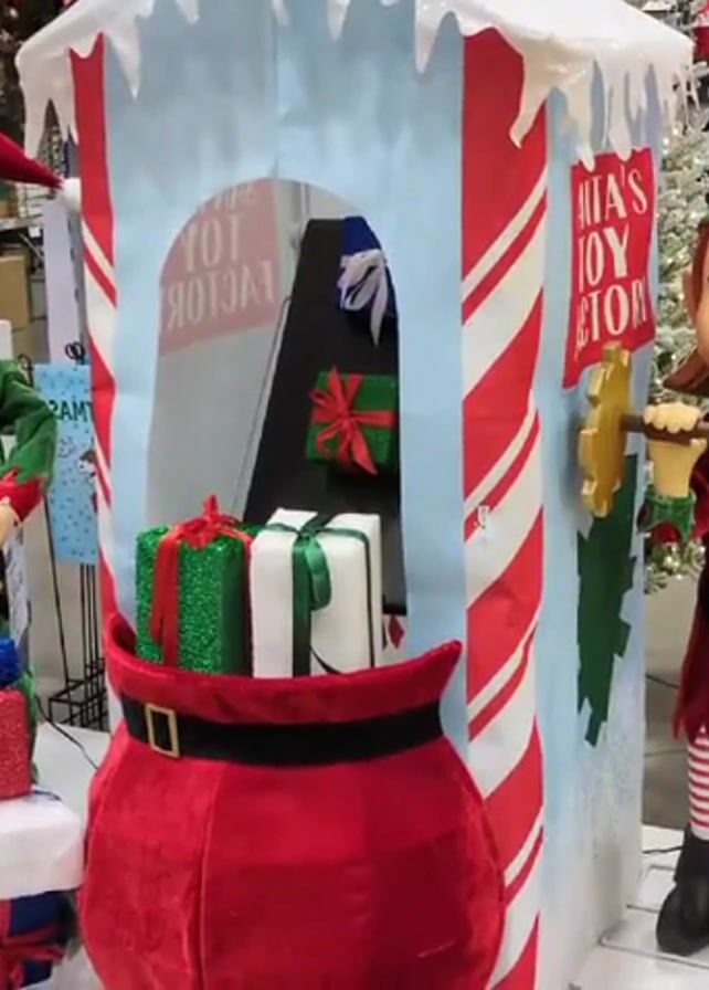 Christmas display in a store. Two elf figures, one male and one female, stand on either side of a booth labeled "Santa's Toy Factory." The male elf is dressed in green and holds a string of lights, while the female elf is in red and holds a hammer. A red bag with gifts is in front of the booth. The booth has a blue and white roof resembling snow. A small Christmas tree is on the right side. A ladder with the text "Little Giant" is visible in the background.