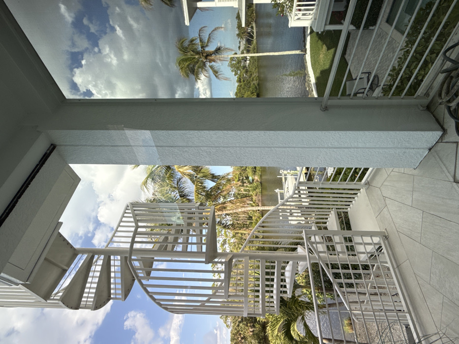 A white spiral staircase occupies the left foreground of an outdoor balcony view in Bonita Springs, United States of America