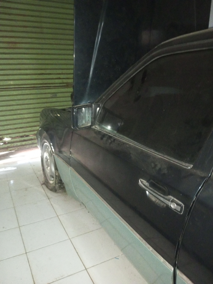 A dusty black car with an open hood sits on a tiled floor. The vehicle has a silver accent strip along the bottom. The front left tire appears flat. A closed, light green, rolling garage door is visible in the background. The lighting suggests an indoor space. The car door is closed and has a shiny handle.