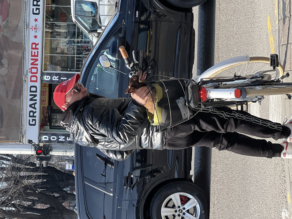 An outdoor, daylight scene depicts an adult male standing on a sidewalk next to a white bicycle on a city street in Varna, Bulgaria. The background features a building with a prominent "GRAND DÖNER" sign, indicative of the general location near bul. "Knyaz Boris I" 11, Varna Center. The man, estimated to be middle-aged, wears a red baseball cap with a visible "BOSS" logo, dark sunglasses, a shiny black puffer jacket over a dark hooded garment, black track pants with white vertical lettering on the left leg, and white sneakers with red accents. He is positioned to the right of the bicycle, with his right hand extended into a black wire mesh front basket. Within the basket, a small, brown dog with pointed ears is visible. The dog rests on a light brown textile item, possibly a blanket, over a lime green lining, appearing alert with its mouth slightly open and looking forward and slightly right. The bicycle is equipped with a red tail light visible on the rear of the basket and a white rear fender. Behind the man and bicycle, a dark-colored SUV (likely an Audi Q7) is stopped or parked. A white vehicle is partially visible beyond the SUV. To the left of the "GRAND DÖNER" sign, a traffic light displays a red signal. The environment includes a paved road surface, a concrete sidewalk with a yellow painted line, and bare trees in the left background under a clear, bright sky.
