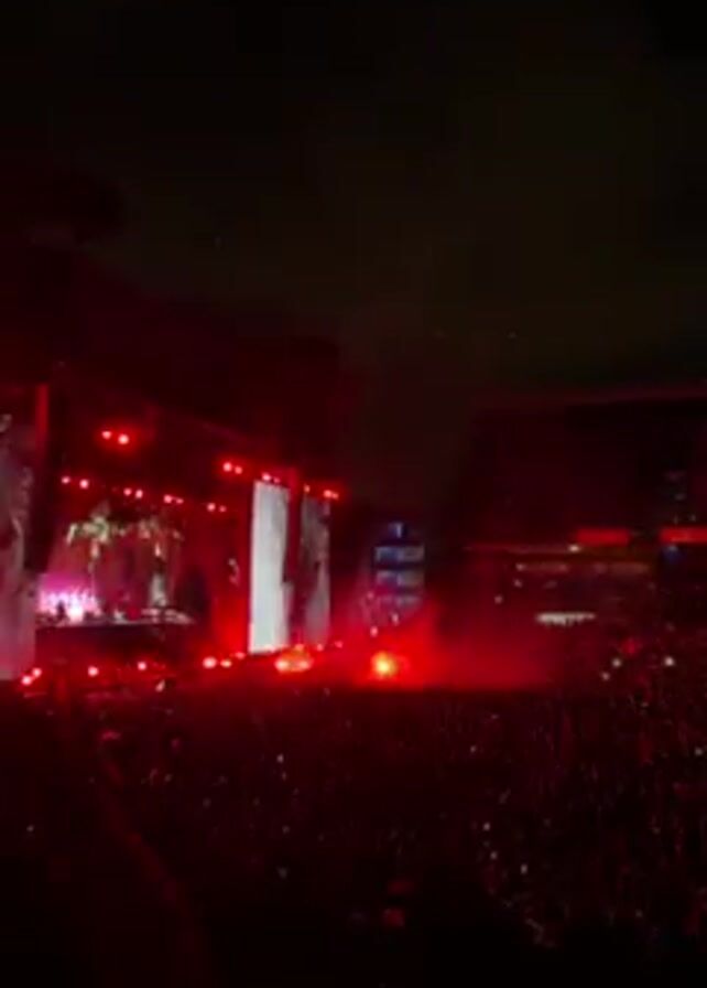 A concert is underway. A large stage is visible, illuminated with red lights and featuring video screens. The stage is set up in a stadium filled with a large crowd of people. The atmosphere is energetic, with a haze or smoke filling the air, also illuminated by the red lights.