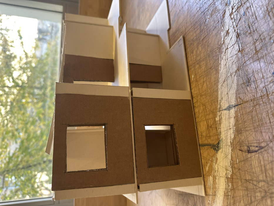 An architectural model, constructed primarily from brown cardboard and white cardstock, is depicted resting on a worn wooden workbench