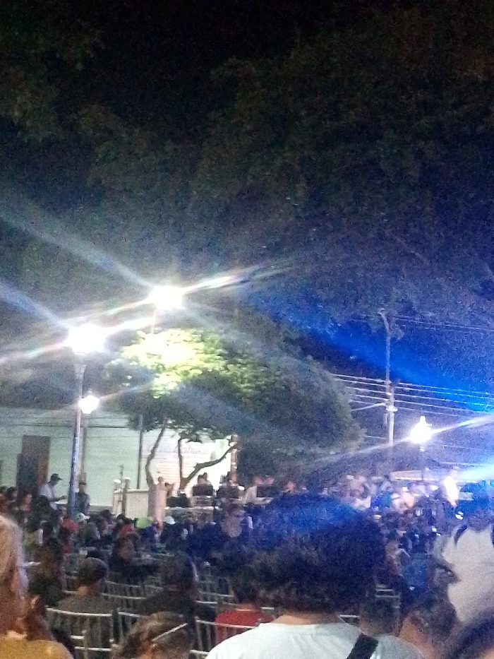 The image depicts an outdoor nighttime gathering in what appears to be a public square or plaza in La Asuncion, Venezuela