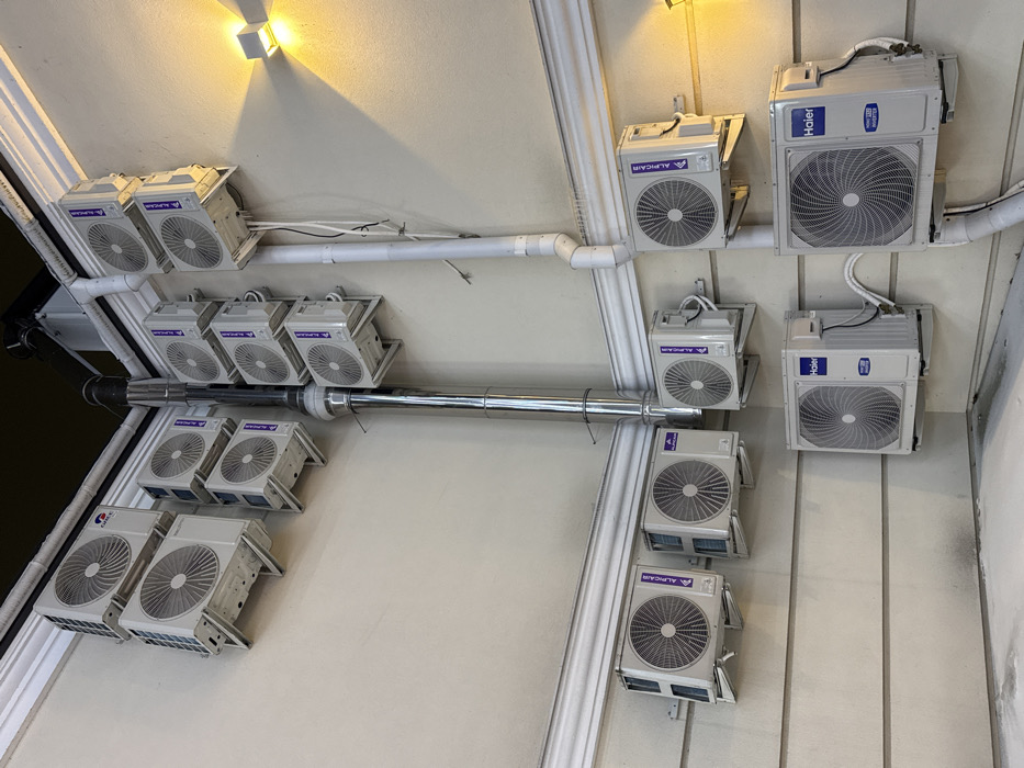 An array of air conditioning units is mounted on a wall. The units are arranged in clusters and rows, with some bearing the "Alpicair" brand and others "Haier". They are connected by pipes and electrical cables. The wall is painted in a neutral tone. The setup appears industrial or commercial, with numerous units to cool a large space.