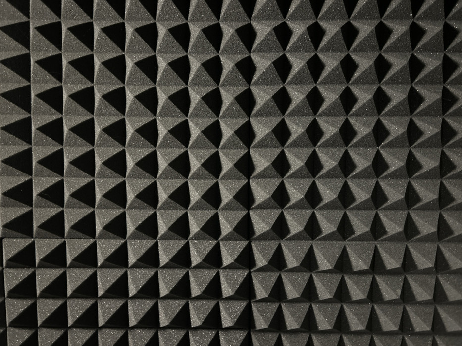 A close-up shot reveals a dense pattern of pyramidal acoustic foam panels