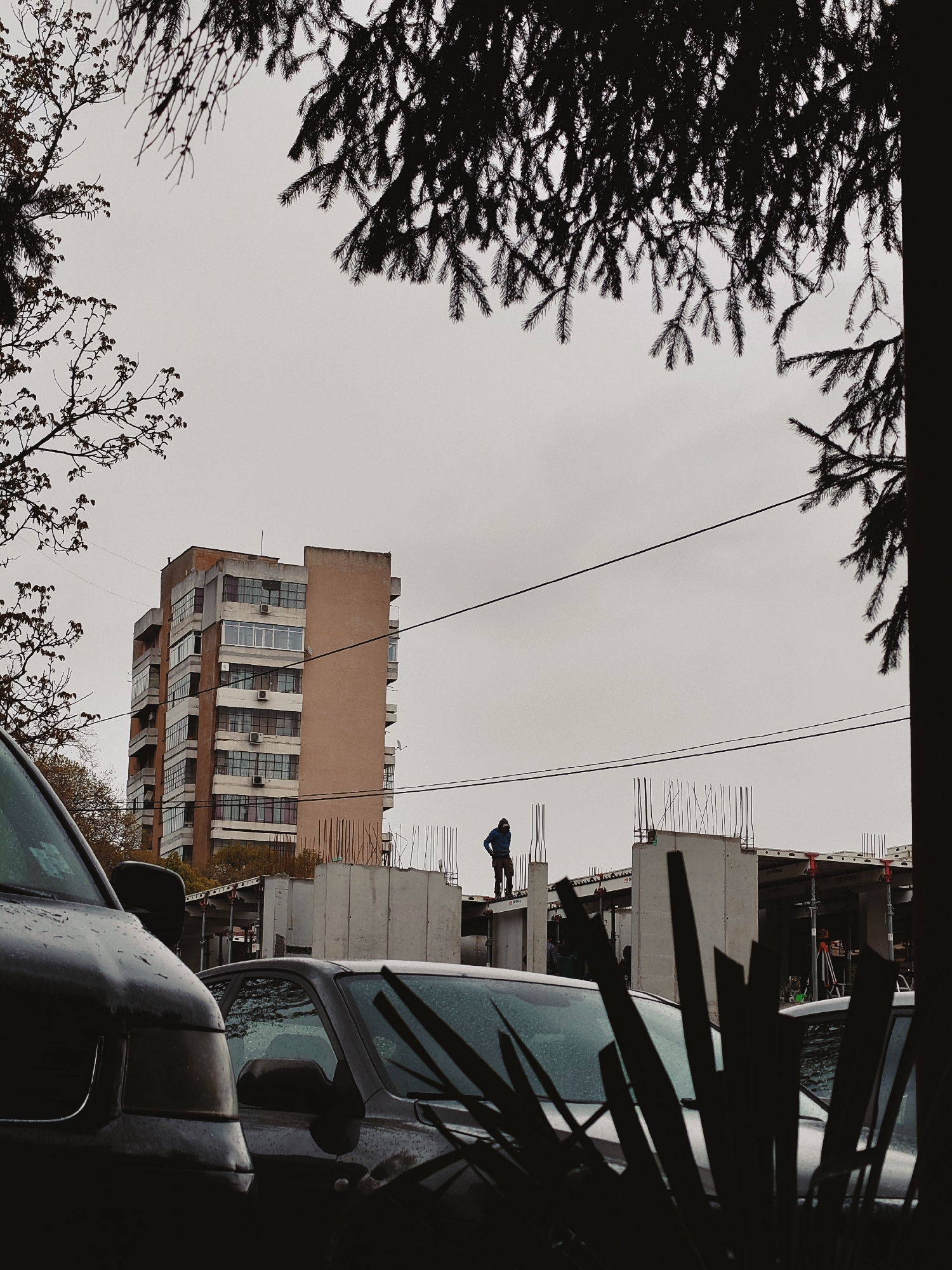 The image captures a scene in Shumen, Bulgaria. It features a partially obstructed view of a construction site with concrete structures, scaffolding, and rebar. A person in a blue jacket stands atop the construction. In the background, a residential building with multiple floors is visible. In the foreground, several cars are partially visible, obscuring the view. Tree branches frame the top of the image, while a vertical element is on the right side of the image obscuring details. The sky appears overcast.