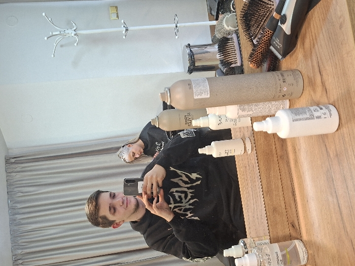 The scene depicts the interior of a hair salon or barbershop, located in Plovdiv, Bulgaria. A young male, reflected prominently in a large mirror, occupies the center-left. He has short brown hair, wears a black hoodie with a white graphic, and is holding a dark-colored smartphone to take a selfie, displaying a faint smile. Reflected behind him on the right, a female subject is seated, wearing a black salon cape, with her hair treated with a light-colored product, indicative of a coloring or lightening process. The foreground features a wooden countertop laden with hair care products, including multiple white, beige, and clear spray bottles, various hairbrushes (paddle and round), and a silver and black hair clipper. The background of the reflection reveals light-colored curtains on the left and a white, multi-peg coat rack on the right against a plain light wall.