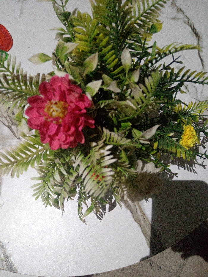 A vibrant arrangement of faux flowers and greenery sits on a white, marble-like surface. A prominent pink flower with a yellow center steals focus, surrounded by delicate fern-like foliage and smaller white and green leaves. A single yellow flower provides a contrasting accent. The composition is well-lit from above, casting a shadow in the lower right corner, suggesting the presence of a container supporting the arrangement.