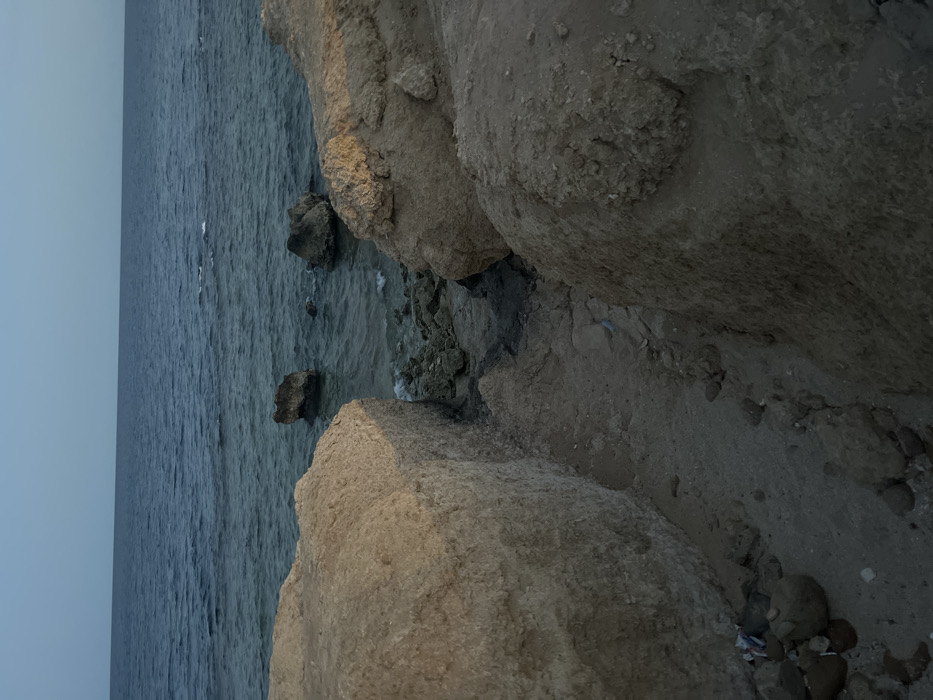 The image displays a coastal scene in Sharm El Sheikh, Egypt, under subdued lighting consistent with early morning or late afternoon. The scene is dominated by a clear, pale blue sky meeting a horizon that separates it from a vast expanse of dark blue, moderately rippled ocean water. In the foreground, two large, light brown to tan rock formations, resembling cliffs, frame a narrow, sandy pathway. This pathway, containing scattered small rocks and what appears to be a white plastic item or refuse on its left side, slopes downwards towards the water. The rock formation on the left presents a relatively sheer, vertical face with a flattened top surface. The formation on the right is more irregularly shaped and eroded, displaying a textured, uneven surface. Closer to the water's edge, the sandy path transitions into an area of smaller, darker rocks and debris. Several dark, jagged rock outcrops are visible within the shallow, greenish-blue water near the shore, while two larger, prominent rocks are situated further out in the deeper blue ocean. No human subjects, animals, or active interactions are present in the scene.