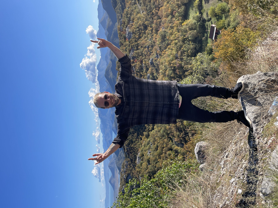 - "A male individual with light-colored hair and a beard, wearing sunglasses, stands centrally on a large, light-grey rock in the foreground" by FM-oln9s2, licensed under CC BY 4.0