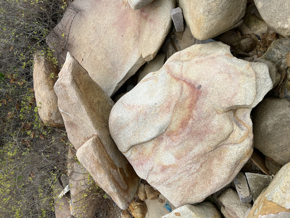 A cluster of light tan and beige rocks dominates the scene. Some rocks have reddish-brown streaks. The rocks vary in size and shape, with angular edges and rounded surfaces. Adjacent to the rocks, a small section of sparse, dry vegetation with tiny green leaves is visible. The scene evokes a natural and rugged environment.
