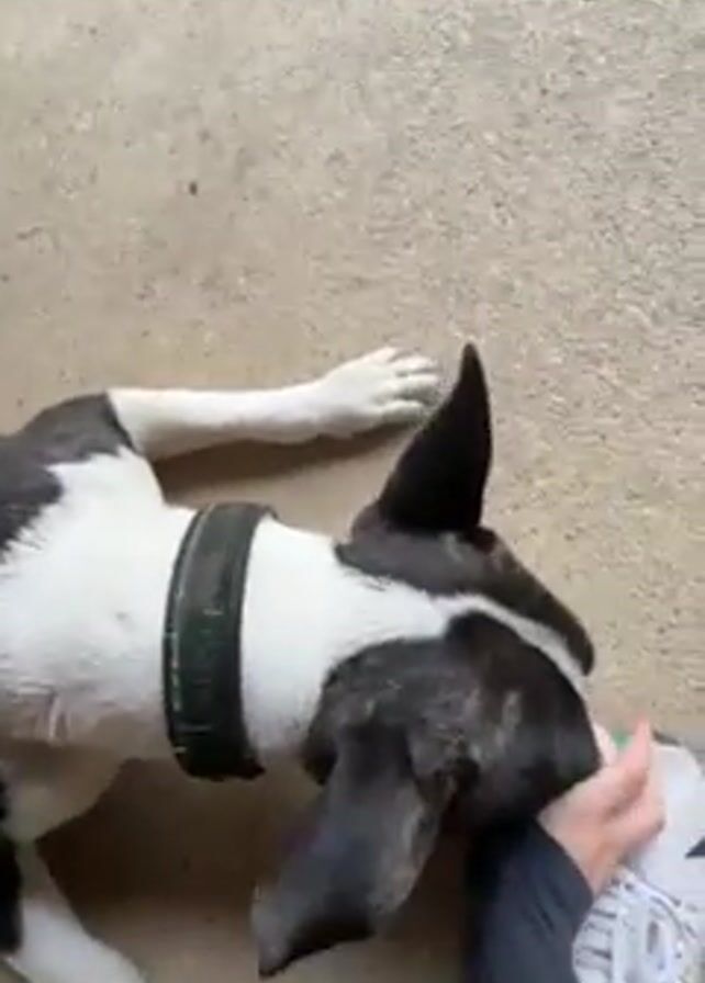 - "black and white dog with pointed ears lying on a light gray concrete surface, wearing a black harness" by FM-hDm3N2, licensed under CC BY 4.0