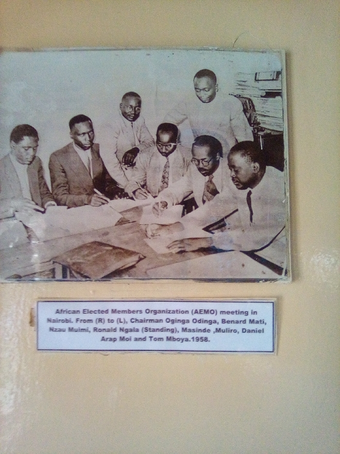 This black and white photograph, appearing to be mounted and displayed on a light-colored wall, depicts an indoor meeting of seven African men. The photograph itself is currently located in South Sakwa ward, Kenya, as specified. The event depicted occurred in Nairobi in 1958. Six men are seated around a rectangular wooden table covered with numerous documents and papers. All seated individuals are wearing suits or collared shirts and ties, actively engaged with the papers. From right to left, the seated individuals are identified by the accompanying caption as: Chairman Oginga Odinga (rightmost, wearing a light suit, left hand on documents, looking right), Benard Mati (wearing glasses, light shirt and tie, holding a pen, looking at documents), Nzau Muimi (wearing glasses, dark suit, holding a pen, looking at documents), Masinde Muliro (wearing a dark suit and tie, holding a pen, looking at documents), and Daniel Arap Moi (far left, wearing a light suit, hands on documents, looking down). One closed, possibly leather-bound, folder rests on the table in the foreground. Two other men are standing behind the seated group, observing the proceedings. The caption identifies Ronald Ngala as standing (prominent, wearing a light-colored shirt, looking down at the table), and Tom Mboya is presumed to be the second standing individual (partially obscured, behind Ngala and Muliro, also wearing a light-colored shirt). In the background, behind the standing figures, a stack of files or papers is visible on what appears to be a shelf or desk. The scene suggests a formal deliberation or signing event.