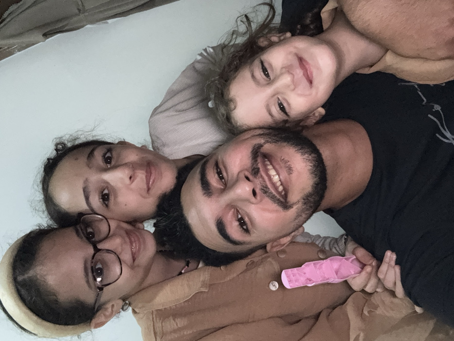An indoor close-up selfie captured in the city of Casablanca, Morocco, features four individuals: one adult male and three younger females. The adult male, positioned centrally in the foreground, has short dark hair and a trimmed beard, smiling directly at the camera while wearing a dark t-shirt. To his upper left, a female with dark curly hair, wearing eyeglasses and a light-colored headband, smiles and holds a pink, textured, possibly plastic object with her left hand. Above the male and slightly to his right, another female with dark curly hair smiles faintly, wearing a light-colored striped top. To the male's lower right, a third female with light brown curly hair smiles brightly. All individuals are clustered closely, looking towards the camera, indicating a familiar interaction. The background consists of a plain, light-colored wall, with a vertical strip of darker fabric partially visible on the far right.