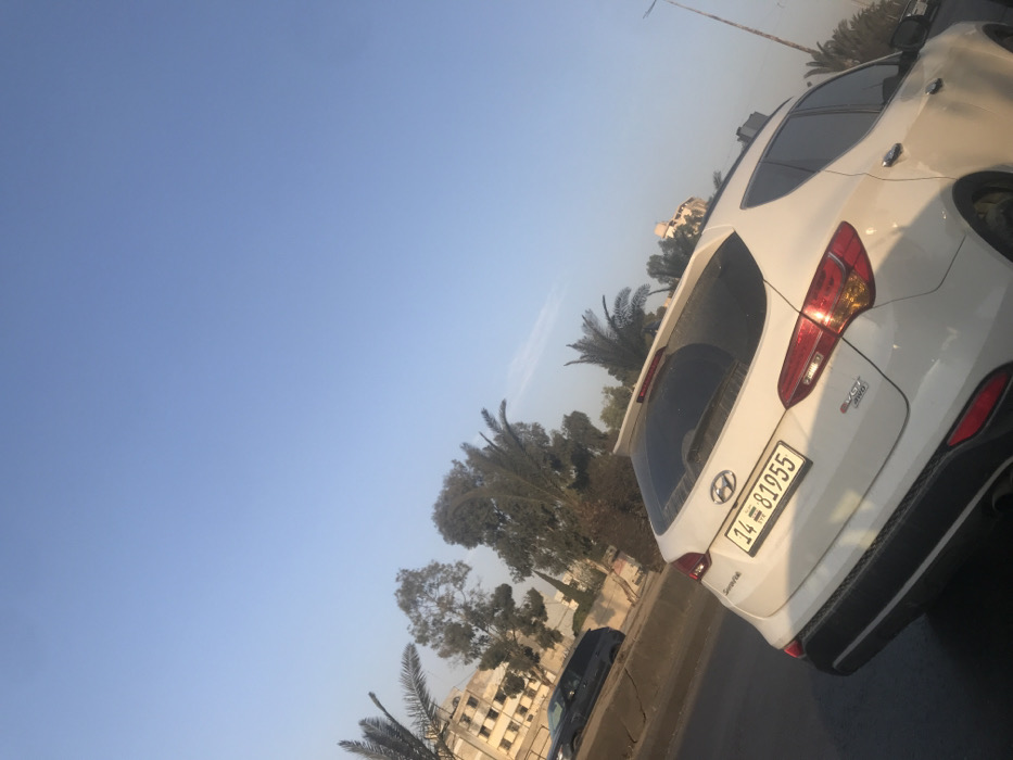 The image depicts a daytime street scene within Ash-Shaghour Municipality, Damascus, Syria. The primary subject is the rear of a white Hyundai Santa Fe SUV, observed from a slightly elevated and angled perspective, occupying the lower half of the frame. The vehicle bears a Syrian license plate, "14 81955," which is centrally mounted on the tailgate. Visible badging includes "Santa Fe" on the left and "VGT 4WD" on the right of the tailgate. The vehicle is positioned on a dark asphalt road. To the left, separated by a concrete barrier or median, a dark-colored SUV is visible, possibly traveling in an opposite direction or parked. In the midground and background, dense clusters of trees, including tall palm trees and broadleaf trees, line the street. Multiple multi-story buildings are partially visible behind the foliage, notably a light-colored building with visible windows on the far left. A tall, thin pole, possibly a streetlight or utility pole, stands on the far right. The upper portion of the image reveals a clear, light blue sky with a faint, wispy cloud streak in the upper right quadrant. No individuals are visible in the scene, and no explicit actions or interactions are depicted beyond the presence of vehicles on a road.