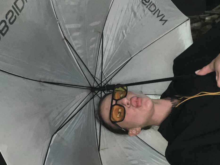 The image displays a close-up, low-angle shot of a female individual holding an open, light-colored umbrella in what appears to be a low-light environment, potentially in Munggu, Indonesia. The subject, viewed from the chest up, has her hair pulled back and wears large, dark-framed sunglasses with orange-tinted lenses. Her lips are pursed in a prominent "duck face" expression. She is wearing a dark, collared garment and a dark choker-style necklace, with a yellow cord visible on her chest. Her right hand is visible, holding the shaft of the umbrella, with the thumb extended upwards in a "thumbs-up" gesture. The umbrella canopy is light gray or silver with black structural ribs. The underside of the umbrella fabric features visible reversed text, reading "NOISIDDAM," and shows minor dark spots, consistent with wear or moisture. The background is uniformly dark and indistinct.