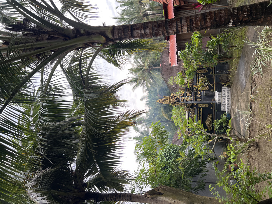 Palm trees frame a scene of a traditional Balinese house, recognizable by the tiled roof peeking through the foliage