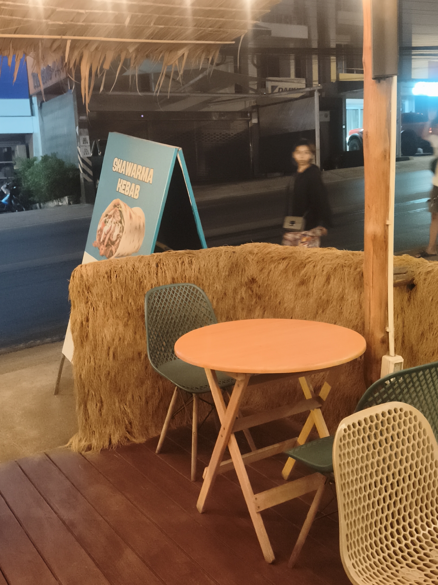 Captured in Baan Bo Phut, Thailand, the image focuses on an outdoor dining area. An orange circular table with folding wooden legs is centered, surrounded by two mesh chairs of green and beige colors. A blue advertisement stand reading "SHAWARMA KEBAB" is positioned on the left. A textured wall or barrier of straw-like material serves as a backdrop to the seating arrangement. In the blurred background, a woman is seen walking on the pavement of a street with commercial buildings. The setting suggests a casual dining area, possibly a roadside eatery. Overhead, a thatched roof provides shade.
