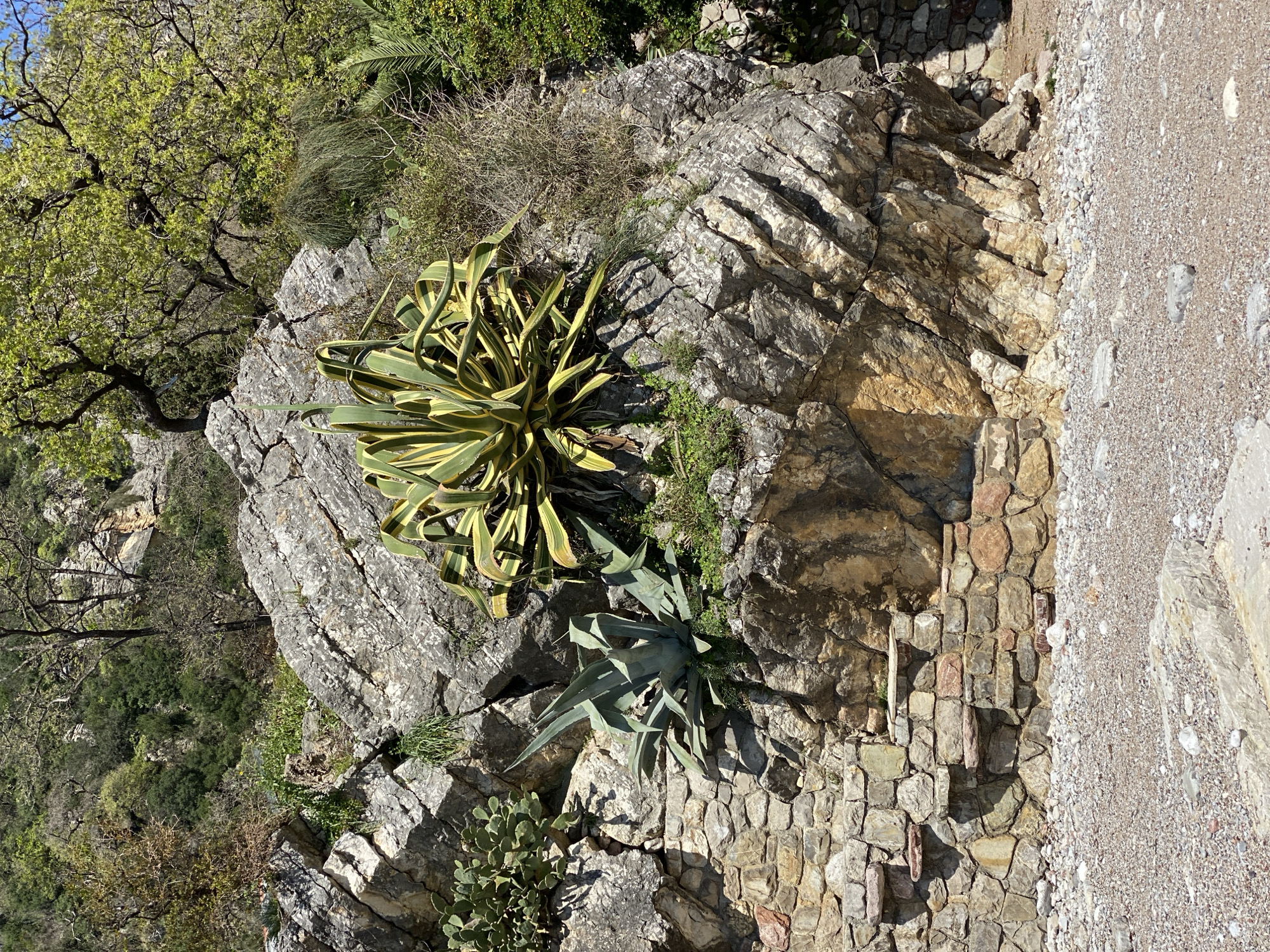 The image depicts a rocky, terraced landscape in Mirište, Montenegro. The terrain consists of layers of striated grey and beige rocks, upon which grow various plants, including a prominent golden-edged agave. A retaining wall constructed from grey stones borders the rocks, transitioning into a gravel path. In the background, there are trees with light green foliage.