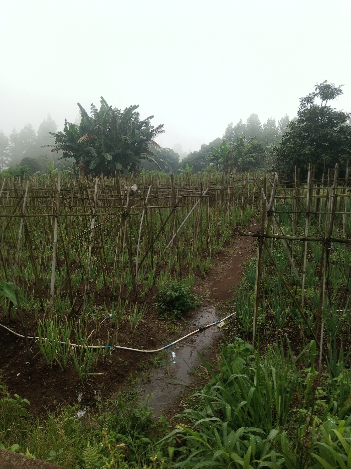 An agricultural field in Joshi Vihir, India, is depicted under overcast or foggy conditions. The scene is dominated by rows of young, green leafy plants, possibly an allium variety, cultivated in dark, damp soil. A comprehensive trellis system constructed from numerous bamboo poles, interconnected with twine or wire, spans the cultivated area, providing support for potential climbing crops. A narrow, muddy dirt path bisects the field longitudinally. In the immediate foreground, a white PVC pipe, part of an irrigation system, runs along the path, with collected water visible around it. Sparse green vegetation and patches of taller grass grow along the edges of the field. The background features a dense treeline composed of varying tree species, including a prominent large banana plant to the left, all partially obscured by the pervasive fog or mist. No individuals are present in the frame.