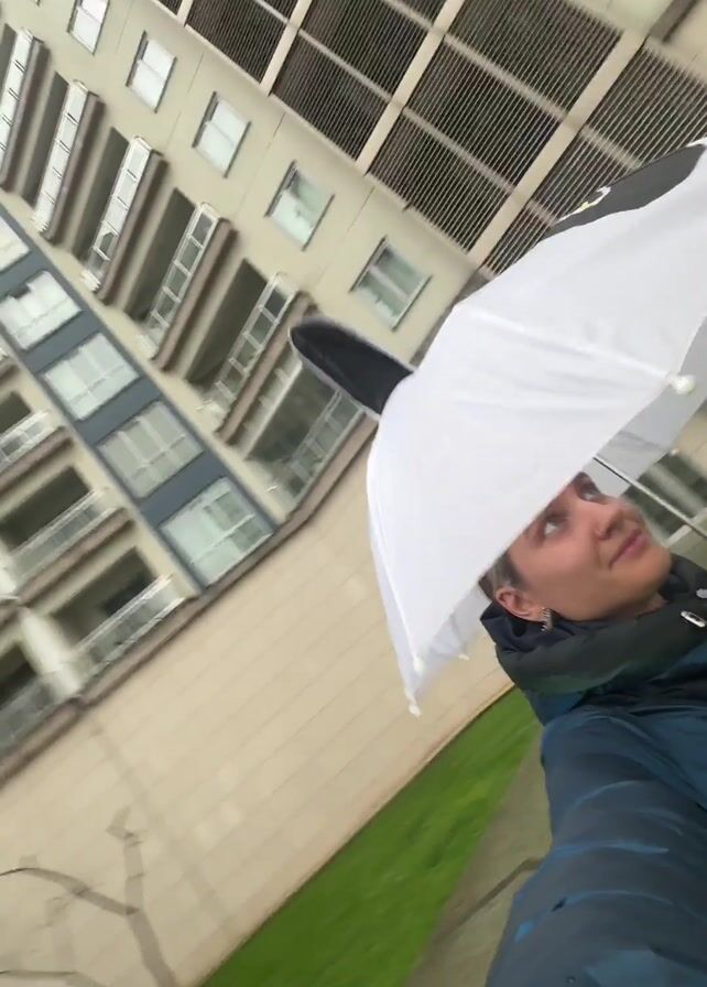 A person is holding a white umbrella with a black and white panda face design and ears attached on top. The person, wearing a dark blue jacket, is looking towards the right. The camera's perspective is upward, showing a blurred background of a tall building with many windows and green grass. The camera is shaking as the person moves.