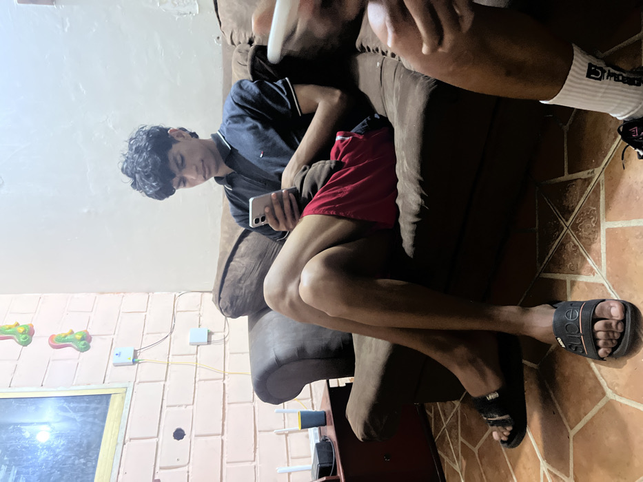 The scene depicts an indoor domestic setting in Flor Amarillo, Venezuela. A young male, appearing to be in his late teens or early twenties, with dark curly hair, is seated on a dark brown upholstered sofa. He wears a dark blue polo shirt with white trim on the collar and sleeves, red shorts, and black slide sandals. His legs are crossed, and he is actively engaged with a light-colored smartphone, held in both hands, with his gaze directed at the screen. Partially visible on the right, another individual's lower right leg is present, clad in a white sock with black lettering and a dark shoe. The left wall of the room features exposed light-colored brickwork, containing a small dark circular hole and a dark rectangular object mounted high up. Three elongated, colorful, abstract-shaped decorative items are affixed vertically to this wall. Below these, two white rectangular electronic devices are mounted, one showing yellow cables connected. The wall behind the sofa is painted a plain light color. A dark wooden side table on the far left holds a white Wi-Fi router with two antennas and a blue and yellow cup. The floor is composed of terracotta-colored tiles arranged in a geometric pattern. The room is uniformly lit by interior ambient lighting.