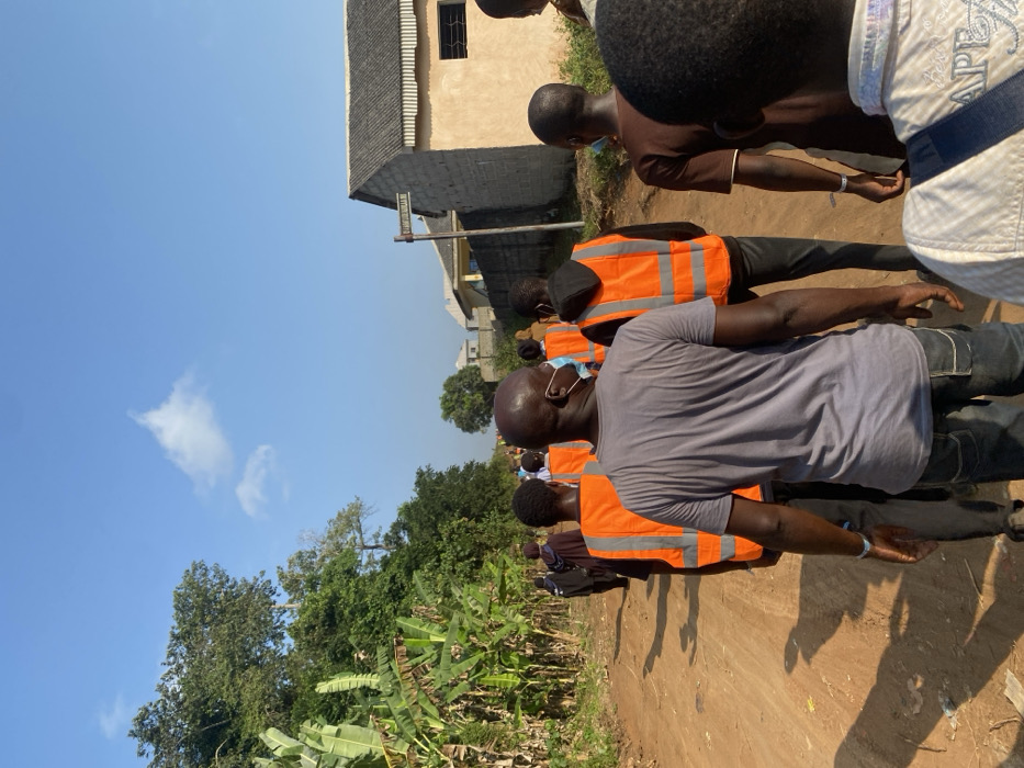 A group of approximately fifteen individuals, predominantly adult males, is observed walking in formation away from the camera along an unpaved, reddish-brown dirt road. The location is identified as Epe, Nigeria, by a visible street sign on the right displaying "OLAMITON ODULAJA ST". Several individuals, including the man in the foreground wearing a grey t-shirt and blue jeans, are equipped with blue surgical face masks; some are positioned below the chin. At least four individuals within the group wear bright orange reflective safety vests. Long, distinct shadows of the figures extend onto the road, indicating clear daylight. The left side of the road is bordered by dense green vegetation, including numerous banana plants and tall trees. On the right, a single-story building with unpainted concrete block walls and a dark corrugated roof is visible, alongside other residential structures in the background. The sky is bright blue with sparse white clouds.