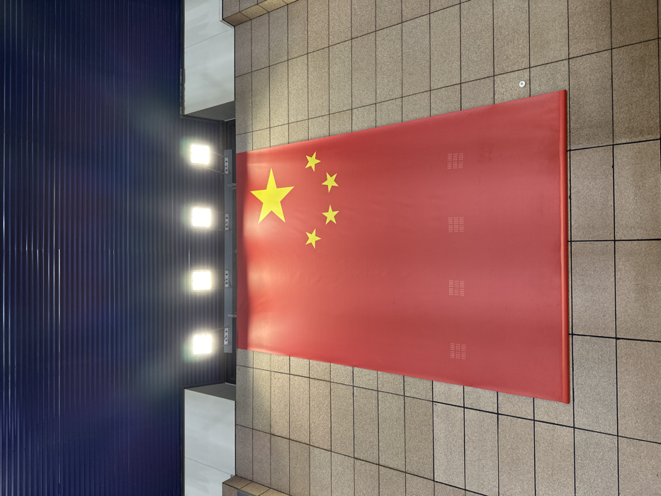 A large, vertically displayed national flag of China dominates a tiled wall within an indoor public environment in Pudong, China