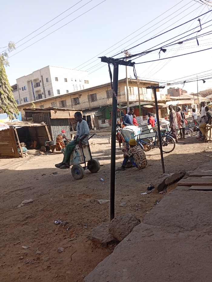 The scene, located in Sabon Gari West, Nigeria, depicts an unpaved, dusty ground under a clear, bright sky. A dark utility pole stands in the mid-foreground, supporting multiple overhead electrical wires that traverse the upper frame. Fragmented concrete structures are visible in the immediate foreground. A male individual, wearing a light-colored long-sleeve shirt and dark trousers, sits facing right on a blue-wheeled, four-wheeled utility cart positioned on the dirt. His feet, clad in sandals, are visible. To the right of this individual, a second person, dressed in a patterned shirt and a yellow head covering, squats on the ground. In the mid-ground, a cluster of approximately six additional individuals stands near several parked bicycles and a light-colored mobile vendor's cart. The background features multiple buildings. On the left, several single-story structures with corrugated metal roofs are visible. Further back, multi-story buildings are present, including a prominent white plastered building with multiple windows on the far left. Scattered debris, including plastic wrappers, is visible on the ground.
