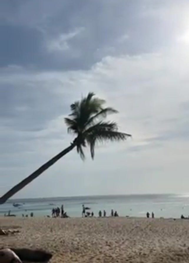 tropical beach with palm trees and people. The sky is bright with some clouds, and the sun is shining. Several palm trees are visible, some leaning towards the ocean. People are scattered on the sand, some sunbathing, others walking along the shore, and some swimming in the water. A red and green umbrella is also visible on the beach. The video shows a relaxed beach scene with natural elements and human activity.
