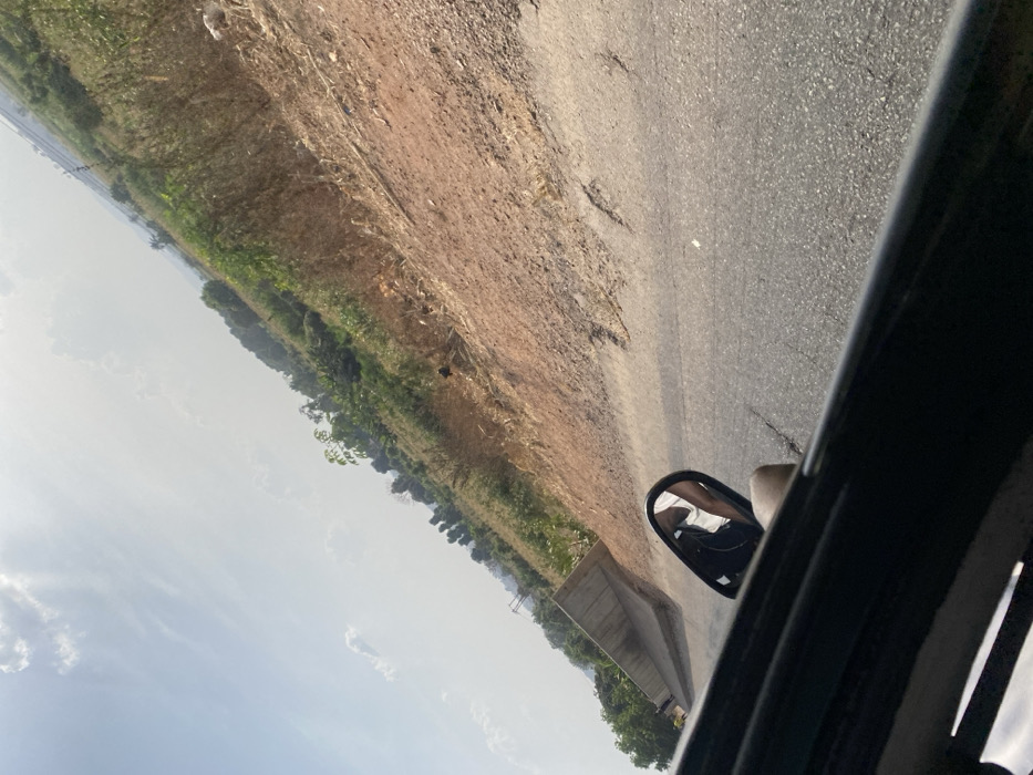 A view from inside a vehicle shows a side mirror reflecting a person. The road is asphalt and has some cracks. To the left of the road is a dirt shoulder and foliage. The sky is cloudy. The shot is angled.