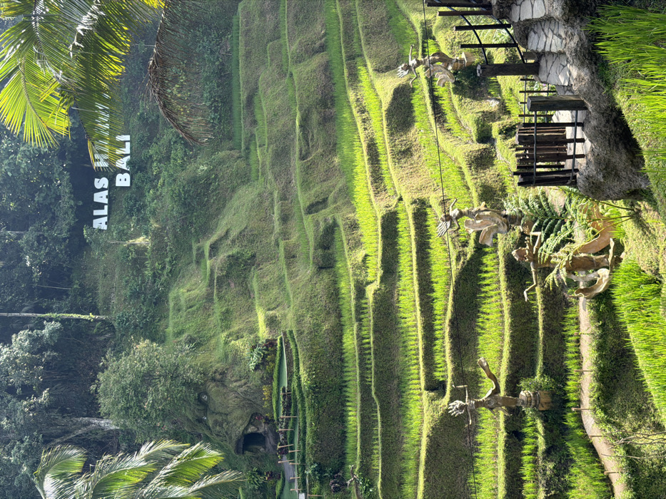 Lush green rice terraces cascade down a hillside in Bali. The terraces are neatly sculpted into distinct levels. Near the top, a small watermill structure adds a touch of rustic charm. Stone sculptures of mythical figures stand guard along the terrace paths. In the distance, a sign reading "ALAS HARUM BALI" is visible amidst the trees. Palm trees frame the scene, creating a tropical landscape.