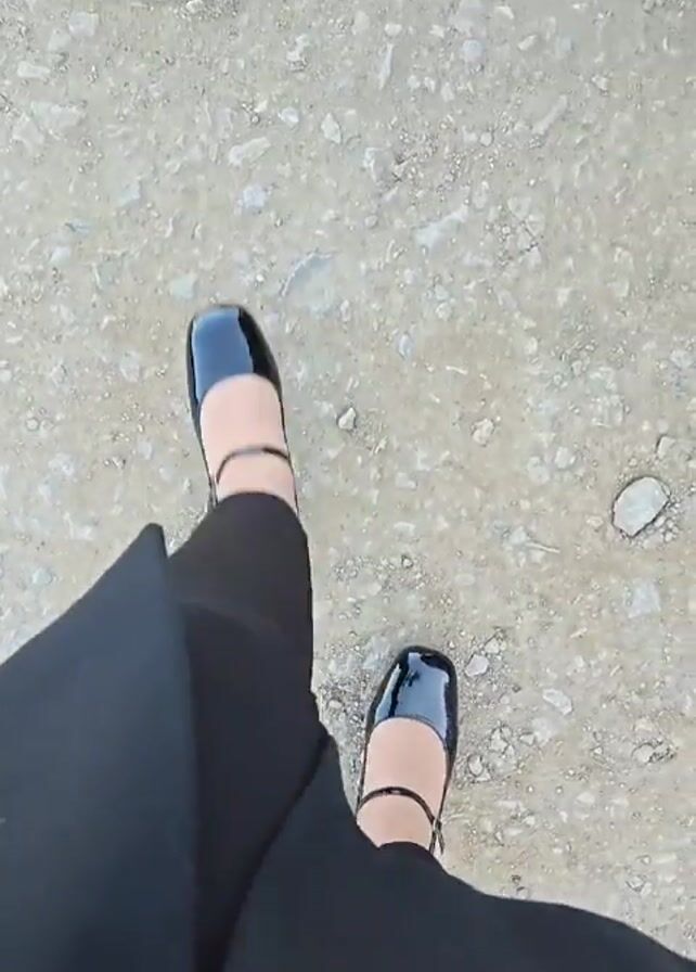 From a first-person perspective, the video shows a person walking on a dirt and gravel surface. The person is wearing black pants and black patent leather Mary Jane shoes with a strap. The camera angle focuses downward, showing the person's feet and legs moving as they walk. The ground is light gray and covered with small rocks. The environment appears to be outdoors.