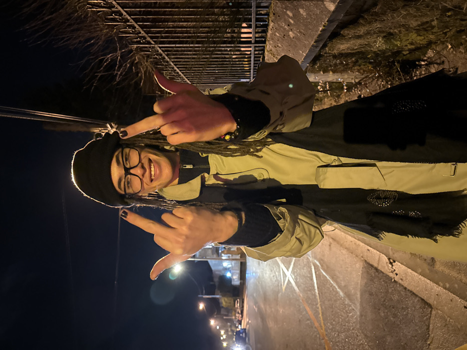 A person with dreadlocks, wearing a black beret and glasses, poses for a photo at night