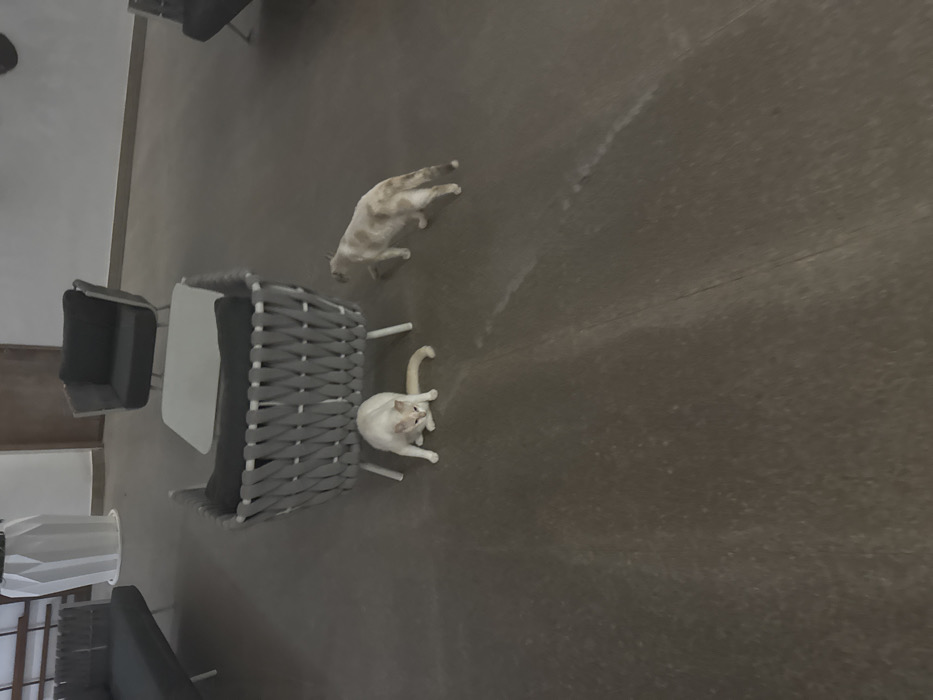 Two cats inhabit a space featuring outdoor furniture. One cat, a pale tan color, walks away from a grey wicker table set. The second cat, mostly white, sits with its back legs spread and its head cocked, appearing to look directly at the viewer. A square table is positioned beside the cat, with a smaller chair to the left. Other chairs and tables are faintly visible near a window to the bottom left. The floor is a mottled grey surface.