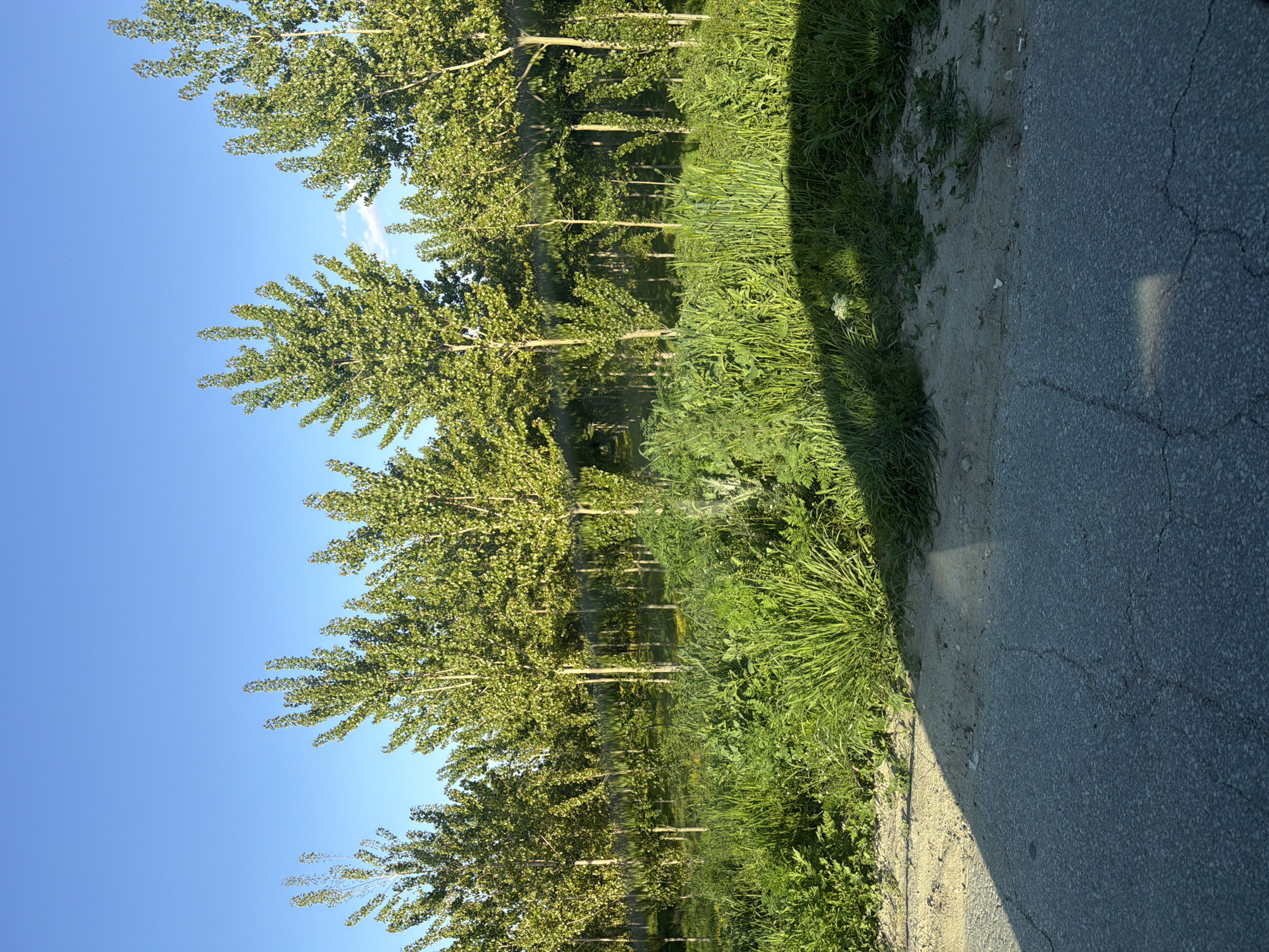 The image depicts a row of deciduous trees bordering a road in what appears to be an urban or suburban setting. The trees are medium height with green foliage against a clear blue sky. Lush green grass and vegetation grow along the edge of the road. The road surface is asphalt with visible cracks. The scene is illuminated by sunlight, casting shadows. The precise location in Trivoditsi, Bulgaria is undeterminable from the image alone. No people or subjects are visible in the frame.