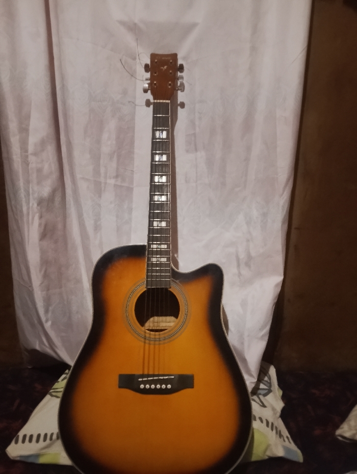 The image displays a six-string acoustic guitar, positioned vertically in a static indoor environment. The guitar features a sunburst finish, transitioning from dark edges to an orange-brown center, and possesses a cutaway body design. Its dark fretboard is inlaid with rectangular white fret markers, and the soundhole is surrounded by a decorative rosette. At the headstock, one string appears broken or detached, with a loose end visible near the upper left tuning peg. The base of the guitar rests on a light-colored cushion patterned with dark horizontal stripes and light blue/green accents. This cushion is situated on a dark, possibly upholstered surface of a maroon or reddish-brown hue. The background consists of a light-colored (off-white or cream) curtain, exhibiting multiple vertical folds and wrinkles. To the right of the curtain, a solid, dark brown vertical surface is visible, likely a wall or piece of furniture. No individuals or actions are depicted. The specific location within Honiara, Solomon Islands, is not discernible from the visual evidence presented.