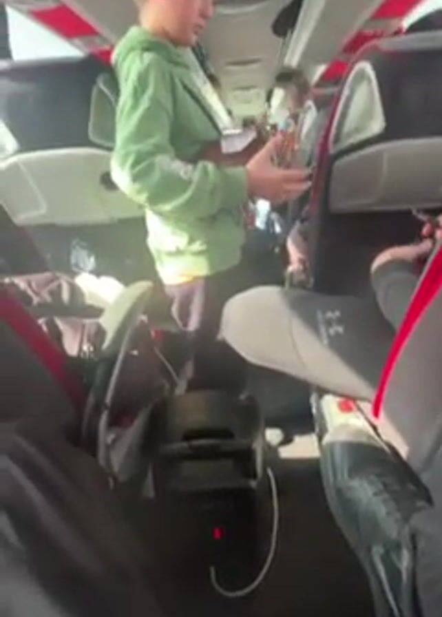 inside of a bus, likely a tour bus, based on the style of the seats. A young boy, dressed in a light green hoodie, stands in the aisle. He appears to be holding and examining an object that is difficult to identify due to the camera angle and obstruction from the bus seats. The boy's expression is focused, suggesting he is studying the object in his hands. Other passengers are seated around him, and a charging station with a cable plugged in is visible near the floor. The overall atmosphere is casual, indicating a moment of rest or activity during the bus journey.