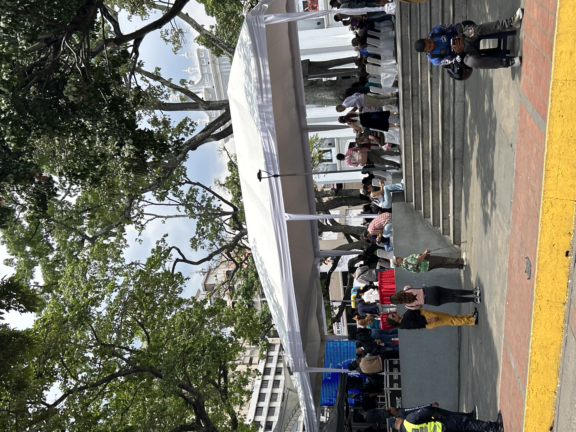 The image depicts an outdoor event in what appears to be a public square in Caracas, Venezuela. A large white tent provides shade over seating arranged on steps. People are seated and standing, observing an event that is taking place on a stage at the front of the tent. Audio and visual equipment are visible near the stage. A police officer is standing by. The background shows buildings and trees, a typical urban landscape of Caracas.