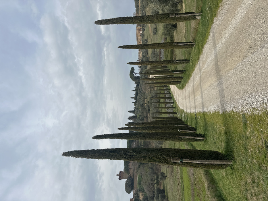 This image depicts a rural landscape near Pienza, Italy, specifically showing the avenue leading to Castello di Cosona