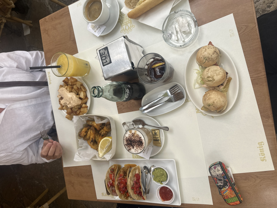 An overhead photograph depicts a light brown wooden dining table at a König restaurant in Girona, Spain. A person, partially visible in a white collared shirt with a dark strap, is seated, holding a silver fork in their left hand. The table is set with white paper placemats featuring the König logo and holds numerous food and beverage items. Specific items include: - A white rectangular plate containing three mini tacos with meat and red diced toppings, flanked by two small white ramekins holding red sauce and green guacamole. - A white square bowl filled with approximately twelve fried chicken wings and a lemon wedge. - A white round plate laden with patatas bravas, topped with a creamy, orange-pink sauce. - A white oval plate presenting three small round sandwiches or sliders, each with a filling and a green garnish. - A clear glass mug of cappuccino with cocoa powder on top, resting on a saucer with a silver spoon and a golden sugar packet. - A tall clear glass containing orange juice with ice and a black straw. - A green glass bottle of Coca-Cola. - A clear glass holding a dark beverage with ice and a lemon slice. - A white ceramic cup of black coffee on a saucer, accompanied by a white sugar packet. - A portion of breadsticks or a small baguette segment, wrapped in white paper. - A rectangular metallic napkin dispenser with a black top, displaying "10E" (likely a table identifier). - A clear glass ashtray containing multiple cigarette butts and crumpled white paper. - A white oval dish with two forks and one knife. - A colorful, patterned rectangular pouch or pencil case. The background shows a dark, possibly stone or tiled floor, indicating an outdoor or semi-outdoor restaurant setting.